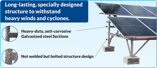 The mounting structure is made from high-grade galvanized steel with a coating of GI 120 GSM, ensuring durability and corrosion resistance. It uses high-tensile strength stainless steel (SS) bolts for secure and long-lasting assembly. Additionally, it complies with all relevant industry standards, ensuring safety, reliability, and performance.